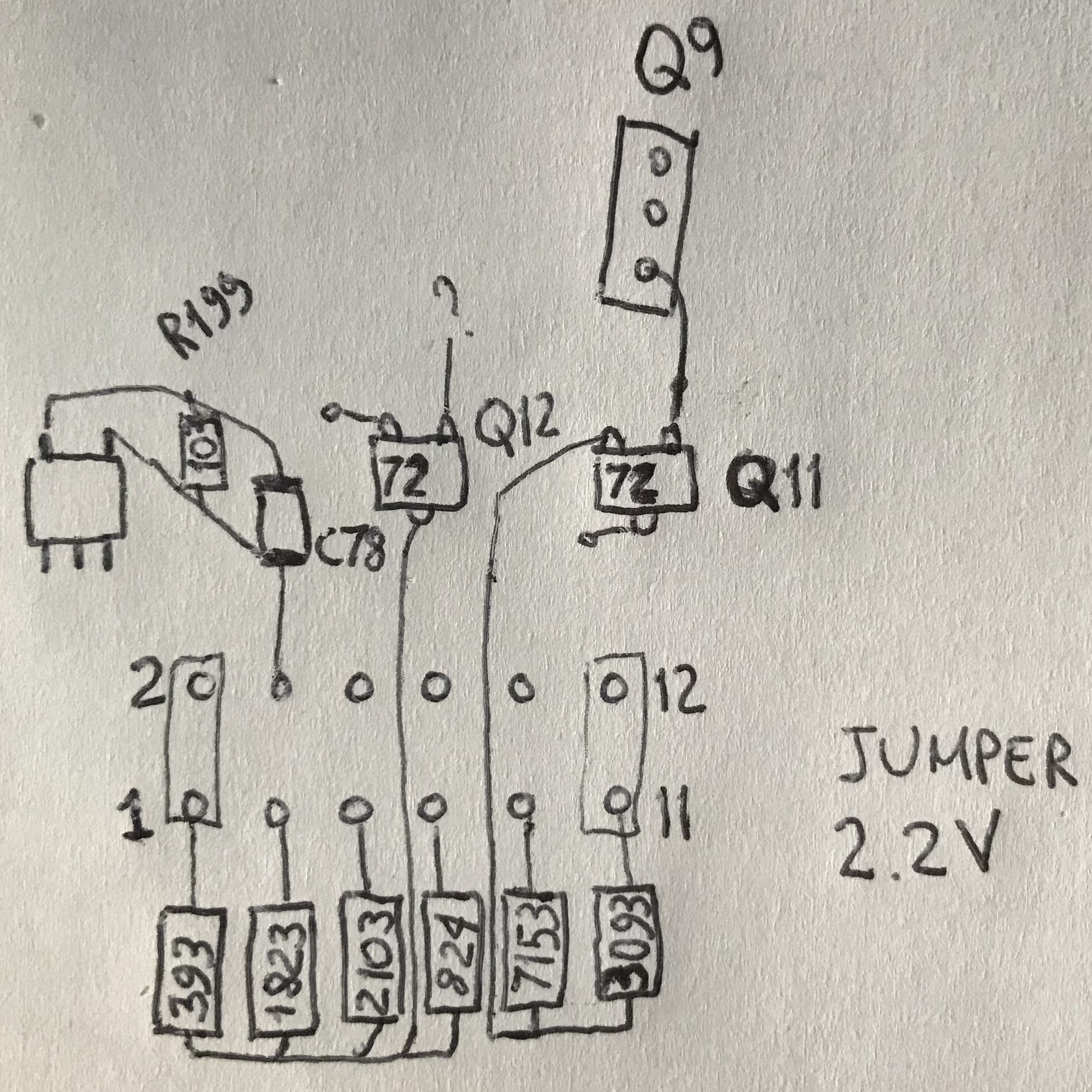 a vedere dove va, perché per me è inutile saperlo, avrei quindi una soluzione al problema, che potrebbe essere usata anche sulle Rev.:1.X, su questo bisogna vedere se i pin 2 e 4 (Rev.:2.X) sono collegati insieme, se è così funziona sicuramente, per ottenere i 2.2V occorre una Resistenza di 39KOHm (393), da collegare al pin 2 da una parte, l’altra invece va collegata dove convergono le piste e proseguono verso Q12, l’idea è di saltare la resistenza dei singoli jumper, in modo che vada ad usare quella aggiuntiva (in questo caso 393 per avere 2.2V
