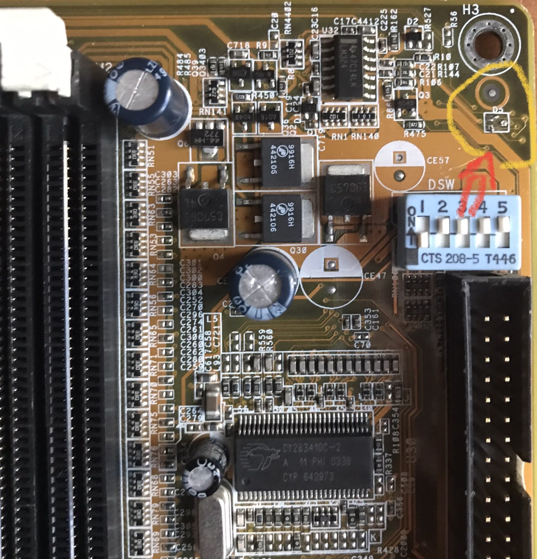 Il problema da risolvere, è la presenza di numerosi condensatori elettrolitici rigonfi, in totale tredici da 1000uF 6.3V, più un altro da 3300uF 6.3V in zona CPU, di quelli c’è ne sono sette in totale, di cui sei in fila, quello rigonfio è tra i sei, decido di toglierli tutti e sei, e lasciare quello attaccato al connettore ATX 20 PIN.