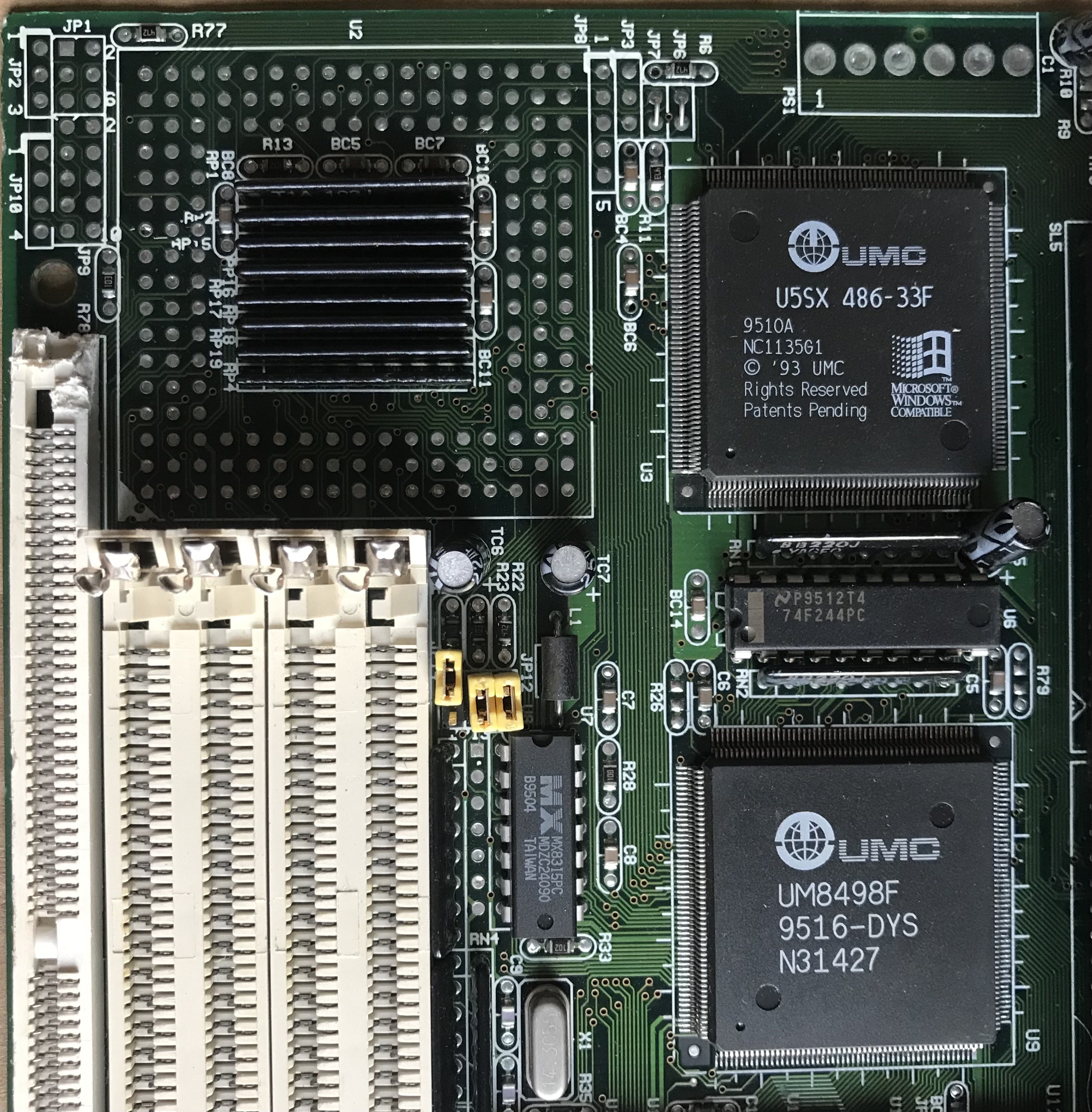 Ho già scritto e mostrato qualcosa in passato, oggi in un ritaglio di tempo ⏱ libero, ho preso tra le zampe 🐾 questa scheda ATC-1411B 486 ISA, un po’ particolare, la prima cosa 😨 che si nota è la CPU saldata direttamente sulla scheda madre, questa cosa 😨 era abbastanza frequente nei 386, meno sui 486, come si può notare, la scheda è predisposta per il socket 2 o (3?), forse 🤔 chi non era soddisfatto poteva passare a CPU DX2, disabilitando quella presente, forse tramite un pin o tramite jumper, al riguardo non so molto, ma la scheda mi piace 😻 con quella CPU saldata, un chip UMC U5SX 486-33F, da quello che so, non si tratta di un clone del 486SX, ma di una versione rivisitata e migliorata da UMC.