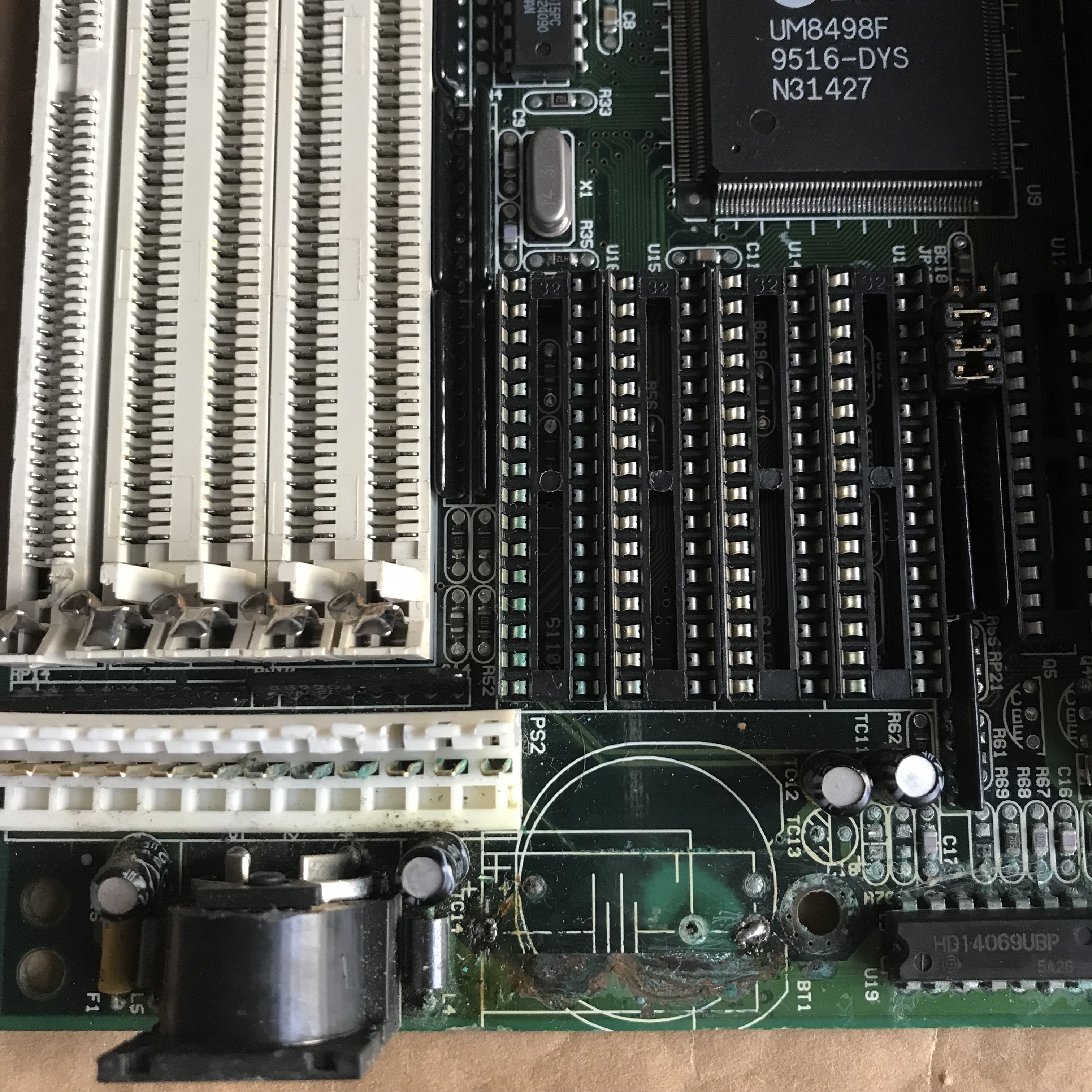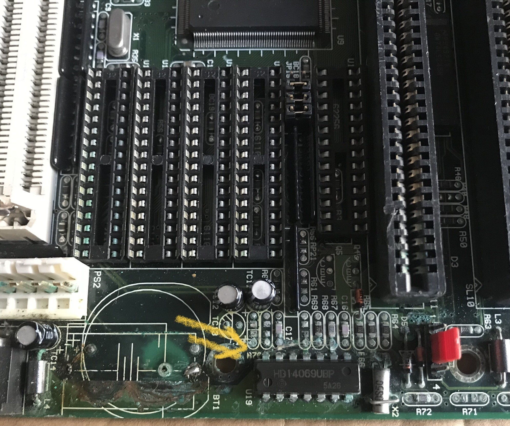 Penso che il connettore AT per l’alimentatore, sia da sostituire, alcuni PIN sono troppo corrosi, non credo valga la pena di pulirlo, rimuoverei anche il chip U19 (HD14069UBP), sia per pulire 🧽 i PIN, sia per vedere le tracce sotto come sono (?), ma il rischio ⚠️ di danneggiare le piste, mi fa pensare 🤨 che inizialmente è meglio pulirlo bene, insomma c’è parecchio lavoro in zona batteria 🪫, in seguito si dovrebbero cercare i chip cache e TAG mancanti.