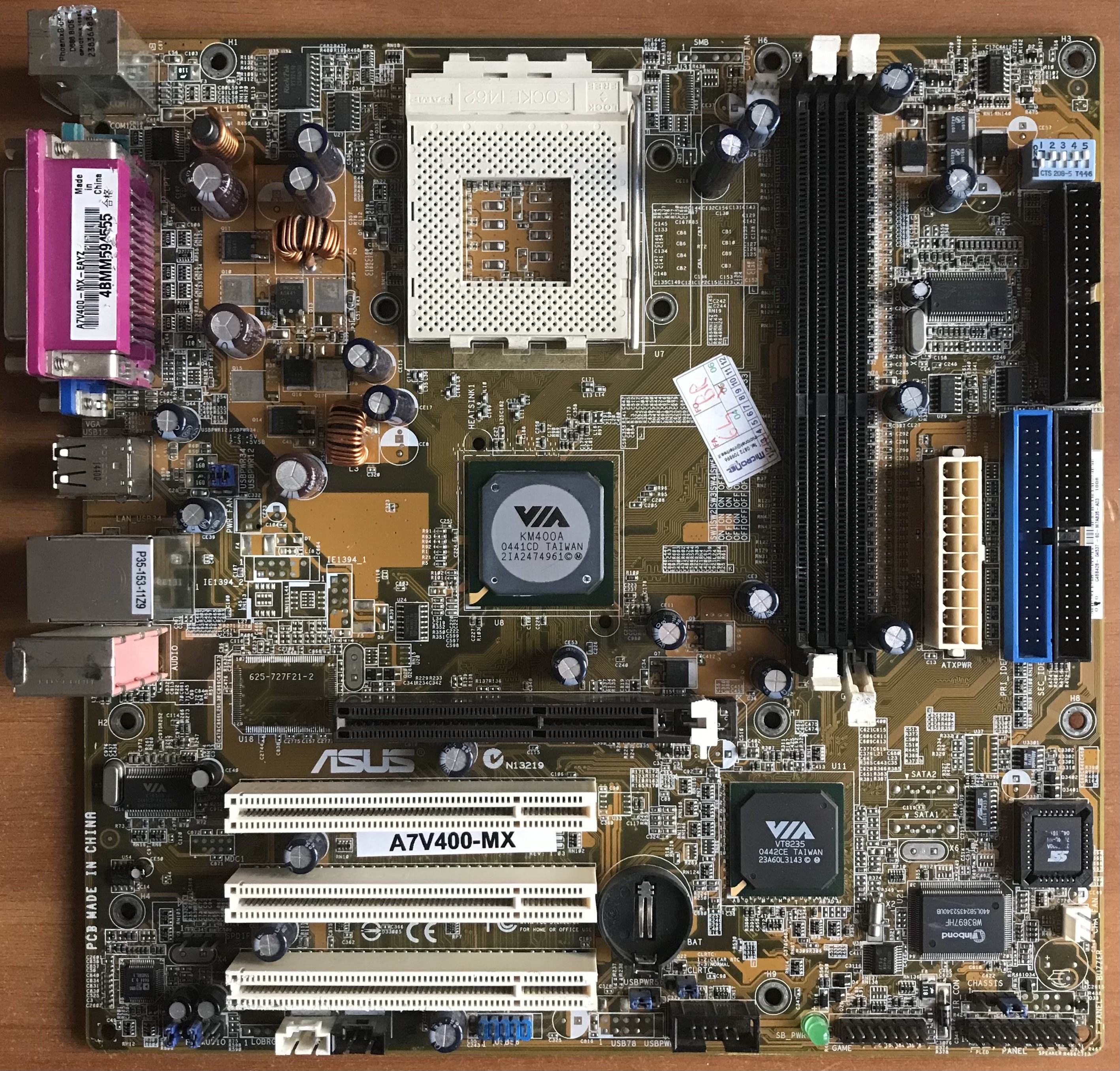Oggi torno a fare riparazioni di schede madri, in passato avevo fatto alcuni lavori su una ASUS (che è un marchio a cui sono molto affezionato), si tratta di una S.462 A7V400-MX formato uATX, con uno slot AGP e tre PCI, nella scheda c’è una VGA integrata, oltre l’audio e la LAN, quindi sarebbe possibile usarla senza alcuna scheda aggiuntiva, gli slot RAM DDR sono solo due, più che sufficienti per una scheda del genere, anche perché non penso sia possibile andare oltre i 2 GB 🇬🇧, ma che può benissimo essere tra 512 MB e 1 GB 🇬🇧, a seconda del Windows usato.