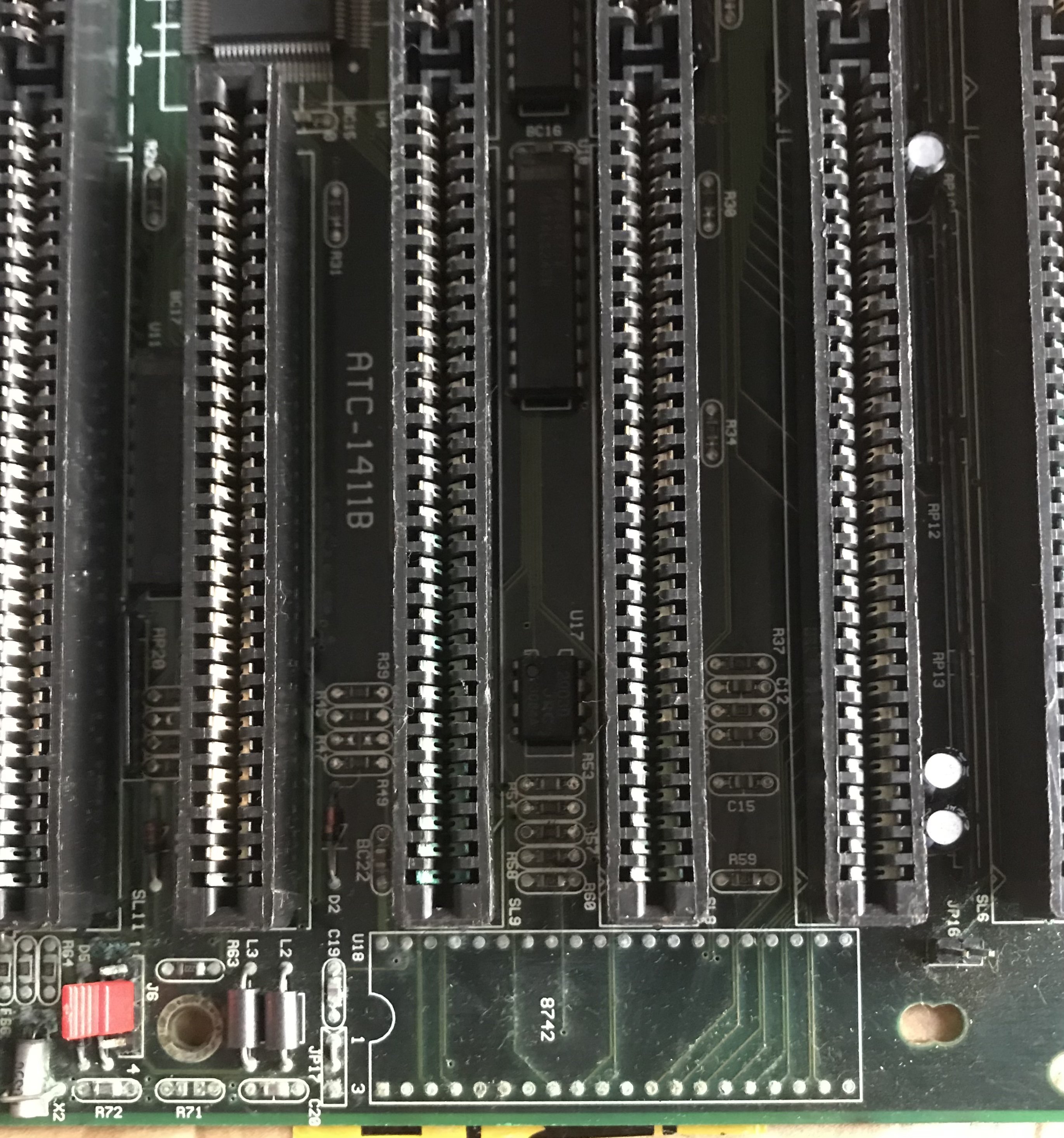 Una scheda madre su cui vorrei ultimare i lavori, è questa ATC-1411B con CPU UMC U5SX 486-33F, i problemi che ha sono abbastanza visibili, c’è ossido verde in molti punti 🧵, perlopiù vicino la batteria 🪫, ma anche sugli slot ISA e sui zoccoli dei chip TAG e Cache, non è possibile usare le RAM 72 PIN, perché da una parte il gancio 🪝 è rotto 😑.