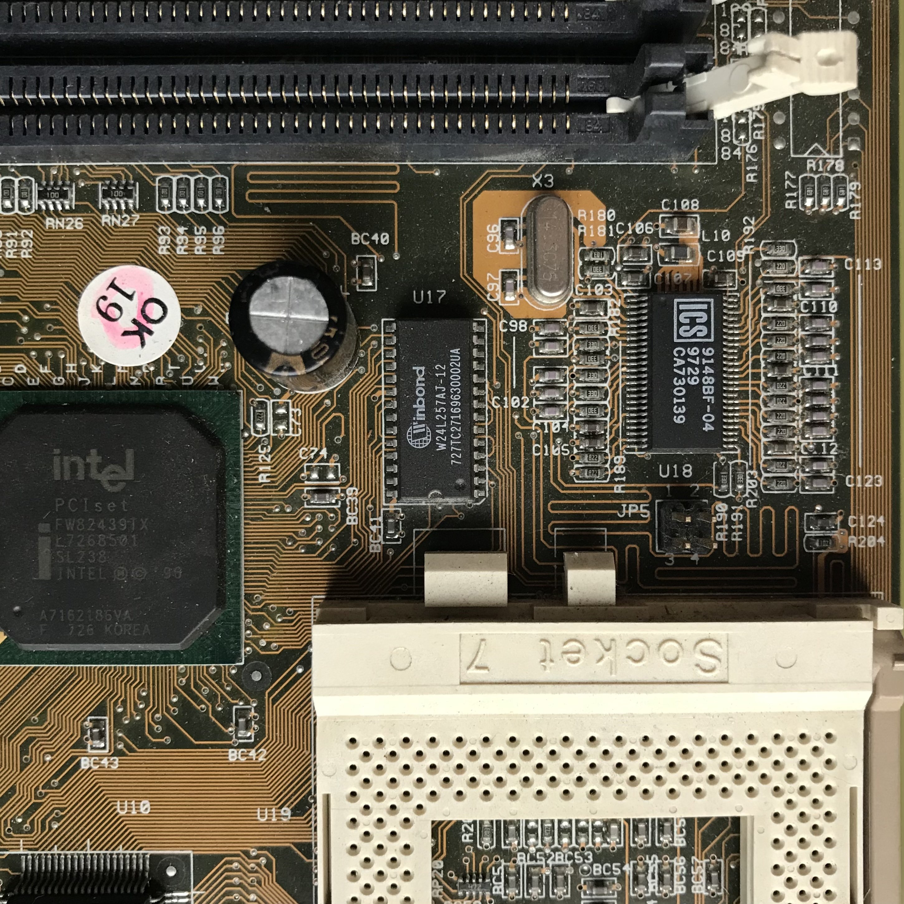 , in seguito dovrei controllare se arriva corrente ai chip, ho notato un possibile secondo problema (di fabbrica?), c’è un jumper JP8, che serve per il voltaggio dei chip cache, non c’è niente collegato, quindi o non arriva corrente, oppure è su un valore fisso, che potrebbe essere 5V oppure 3.3V, se anche questo non risolve, dovrei cercare se per caso c’è altro che mi sfugge.
