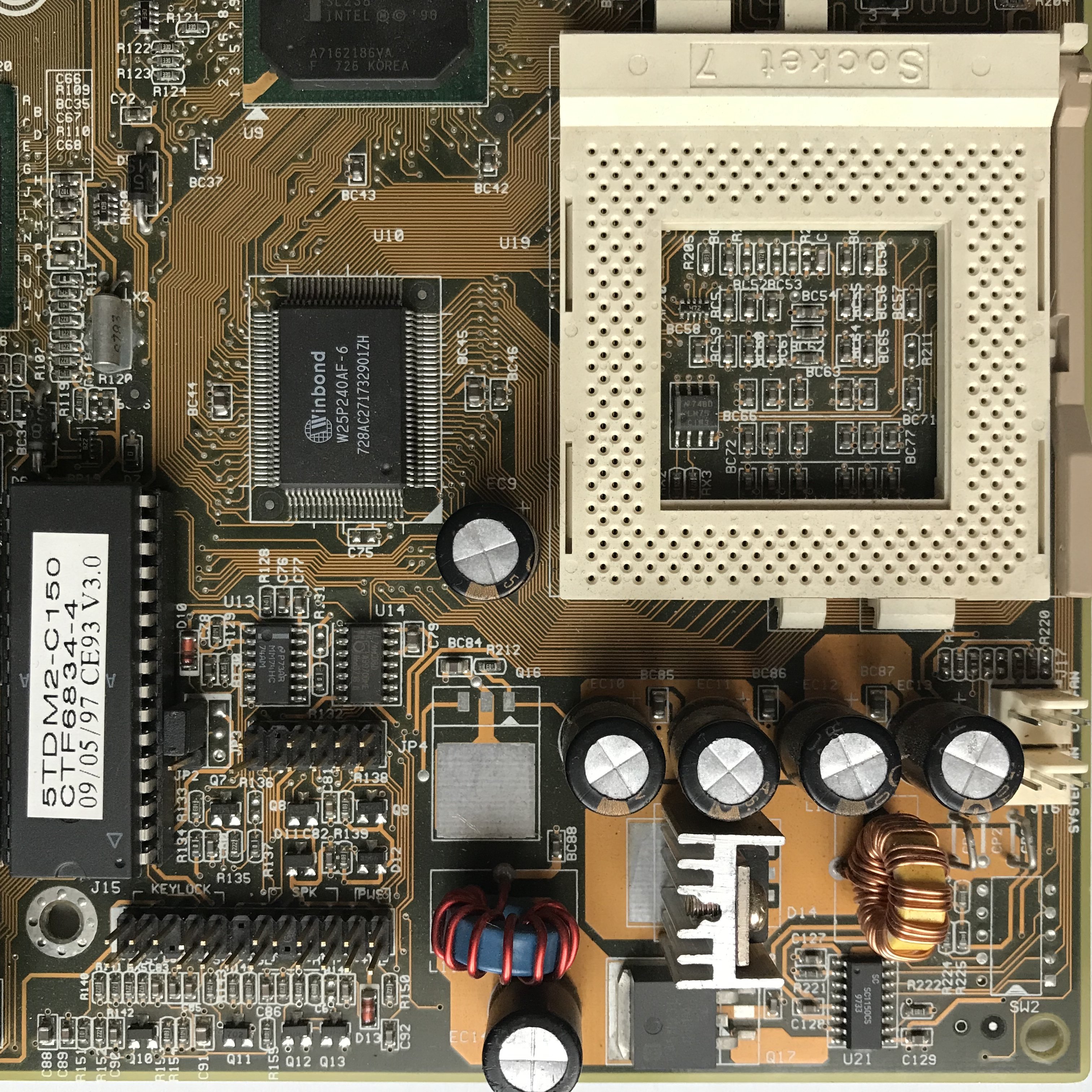 L’ultima scheda è una Chaintech 5TDM2, chipset Intel i430TX, non ha jumper per la selezione della CPU (FSB VCORE Multi ecc…), in realtà ci sono alcuni jumper, ma riguardano altro, dovrebbe avere un BIOS tipo quelli di QDI o ABIT, in grado di riconoscere automaticamente la CPU e il voltaggio, bisogna solo entrare nel BIOS e scegliere la velocità corretta, perché di solito parte inizialmente con frequenze basse, poi volendo si potrebbe provare se è possibile fare un overclock. -