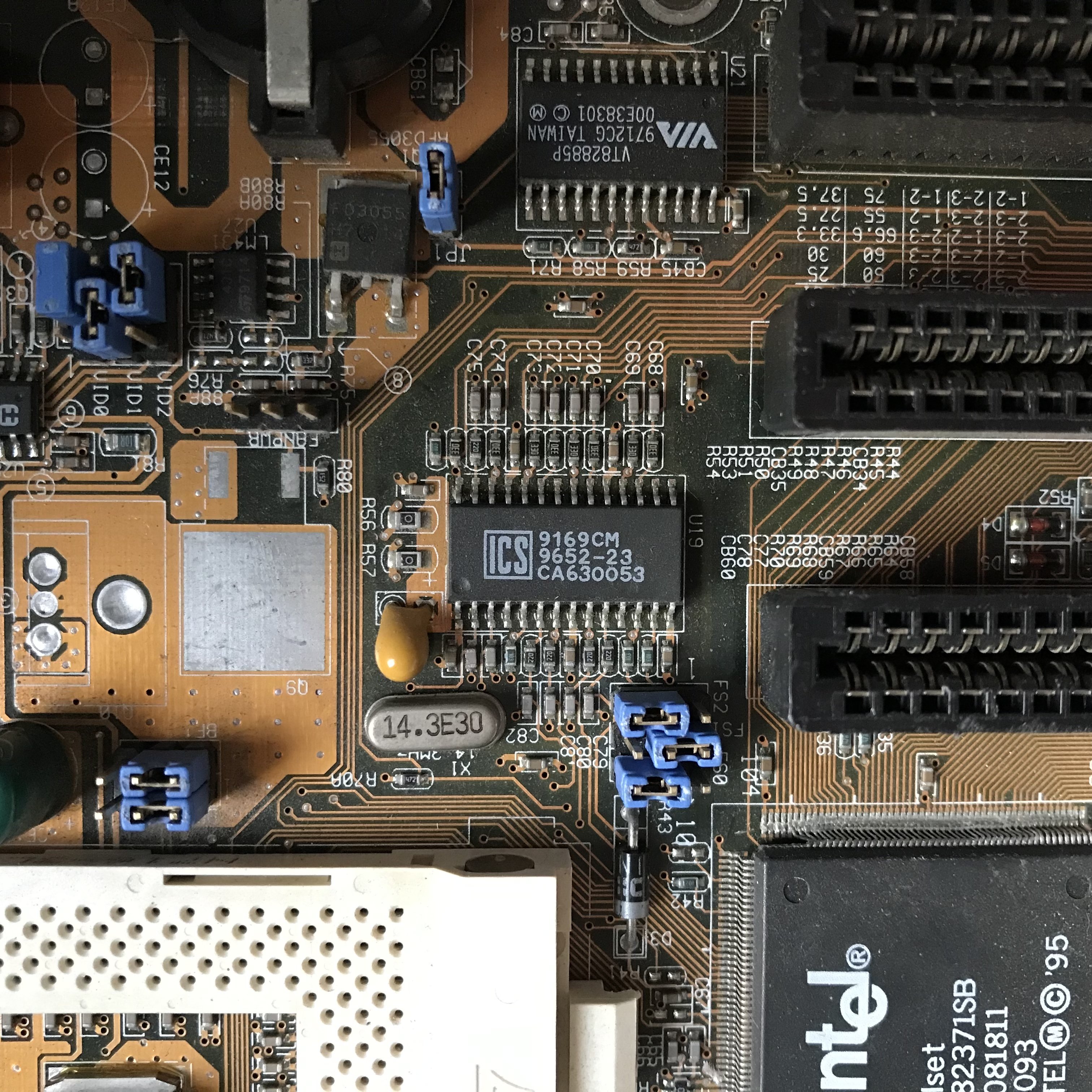 Per quanto riguarda le frequenze di FSB, quelle sul manuale sono le frequenze usate dalle CPU del periodo, il 75 MHz era per le CPU Cyrix 6x86 200 (in seguito MII), queste funzionano a 150 MHz (2X75), nulla però vieta l’uso con altre CPU, penso che dovrebbe essere possibile trovare altre frequenze (impostazioni segrete), ad esempio 68 o persino 83 MHz, non credo ci siano quelle con PCI fisso a circa 33, o se ci sono non funzionano, perché sembra che i chipset Intel non li supportano, dovrò fare un controllo, guarderò il generatore di frequenza, da quello trovo tutte le impostazioni possibili, magari a sorpresa