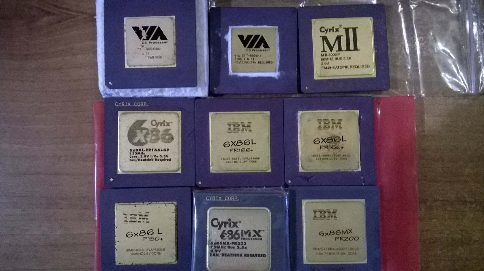 Gran bella collezione, ricordo quando iniziai a collezionare CPU, comprai un lotto di una dozzina di Celeron Mendocino che comprendeva anche due PIII 700/100 SKT370, in quel periodo si potevano trovare grossi lotti di CPU Cyrix-IBM a prezzi abbastanza contenuti, purtroppo allora li snobbavo insieme ad altri tipo i 486 e i 5X86. Del 5X86 infatti ho solo un paio di AMD, il lotto di Celeron l'acquistai per upgradare il mio PC che aveva su un 433, nel lotto c'erano un 533 e un 466 oltre ad altri di frequenza inferiore, peccato che sia il 533 che il 466 fossero stati overclockati fino al cedimento (in pratica non funzionavano). Così trovai un 500 d'occasione, e appena riuscii a trovare un'adattatore slot1 misi su uno dei PIII 700, poco dopo lo cambiai con un 900/100, e infine con il 1000/100.