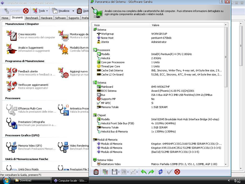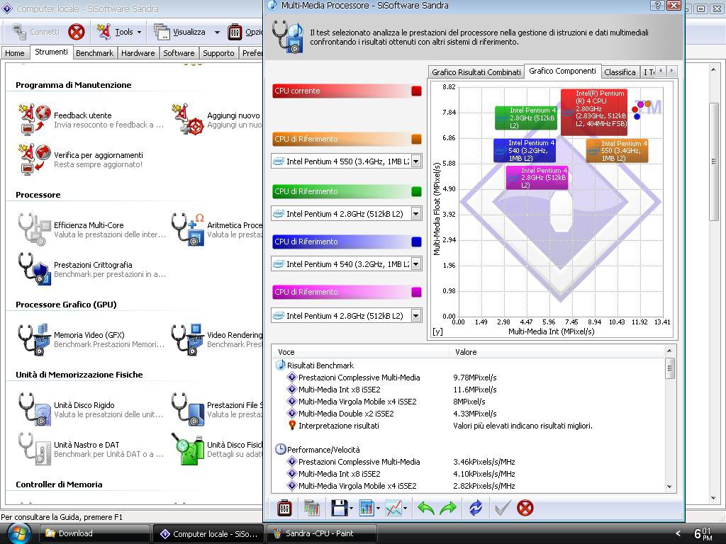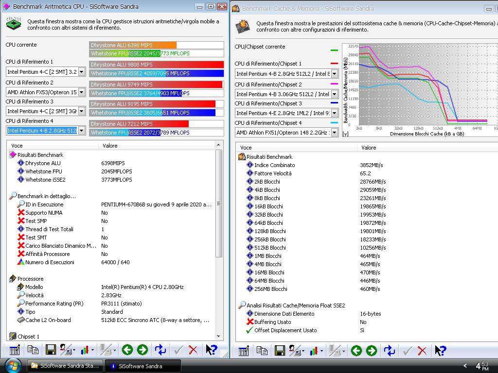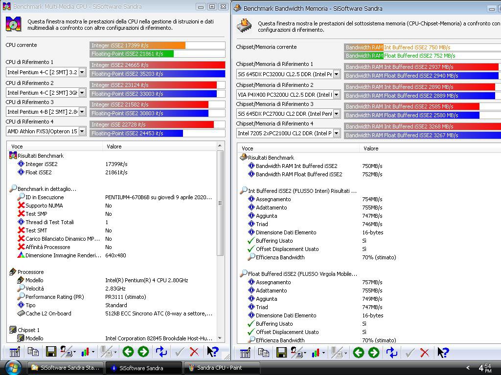Metto alcuni bench fatti con il mio vecchio PC Internet, un P4 2800/512/400 con 1,5GB RAM PC133, tra questi ci sono quelli di Sandra 2010 (file che ho trovato tra quelli archiviati).