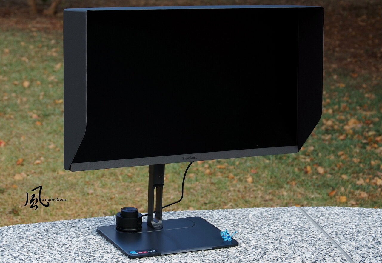 The metallic build lends the base weight and good stability. The monitor weighs about 8.4kg altogether, and the simple design of the VP2776 gives it a high-quality feeling.How it looks with the calibrator and magnetic hood covering installed.