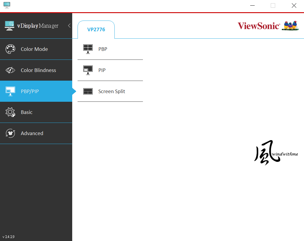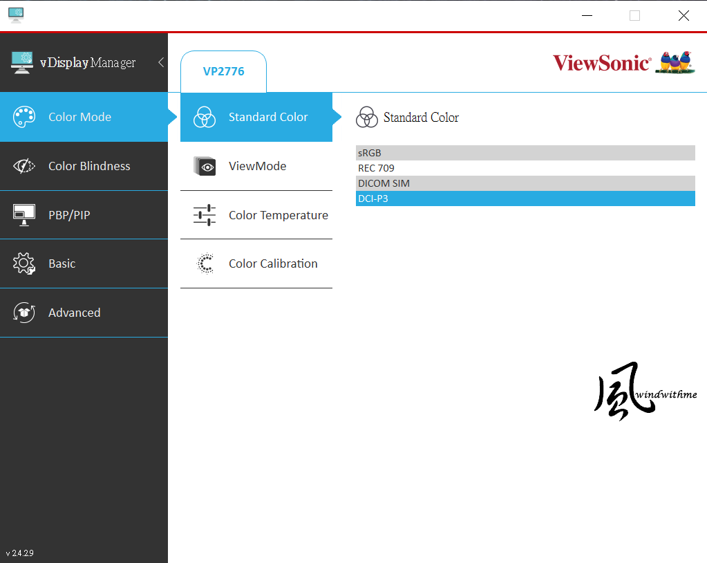 There are two main software packages included. First, vDisplay Manager: the left-side menu options are Color Mode, Color Blindness, PBP/PIP, Basic, and Advanced. In Color Mode, the Standard Color menu provides four color standards to choose from.