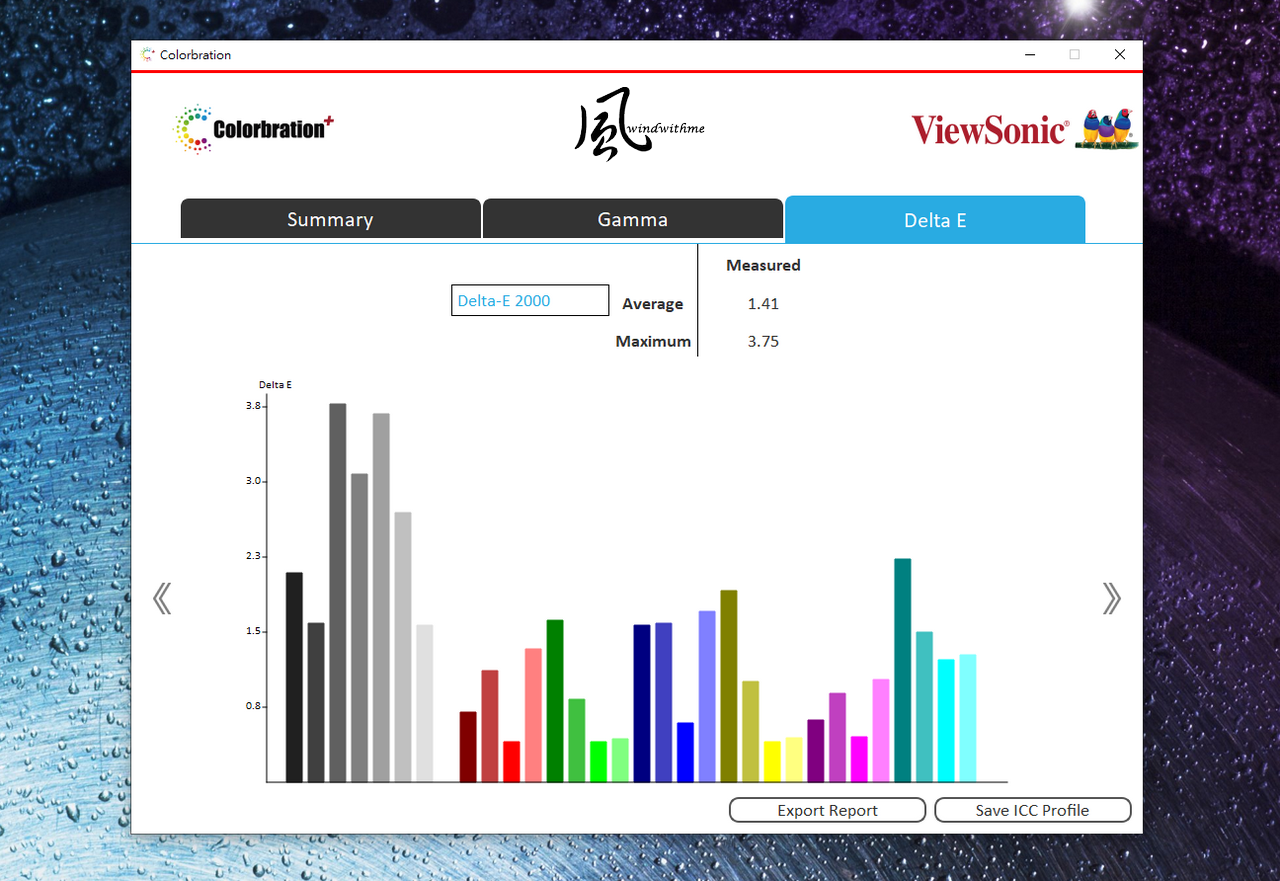 The report’s Summary, Gamma, and Delta E tabs detail the color gamut and related info.